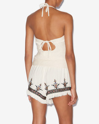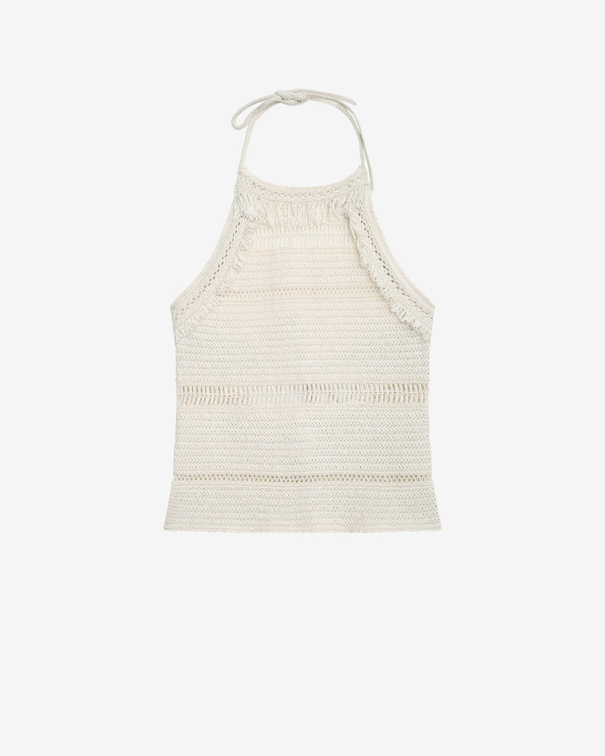 Plain-colored open back sweater in fringed macrame knit American neckline Tied around the neck Tied open back Fringed finishes Short and fitted cut Style: PU0660FAC1L09E23EC ARALIANE 100% cotton