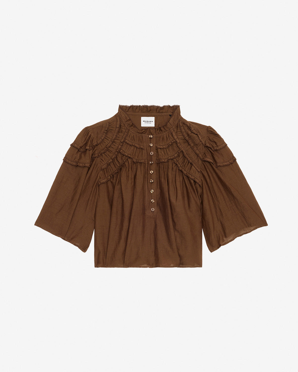 Gathered cotton voile blend top Round neckline with gathered finishes Buttoned front Gathered front and shoulder details Short loose sleeves Short and flared cut Style: HT0665FBB3J04E67DK CARMEN 80% cotton, 20% viscose