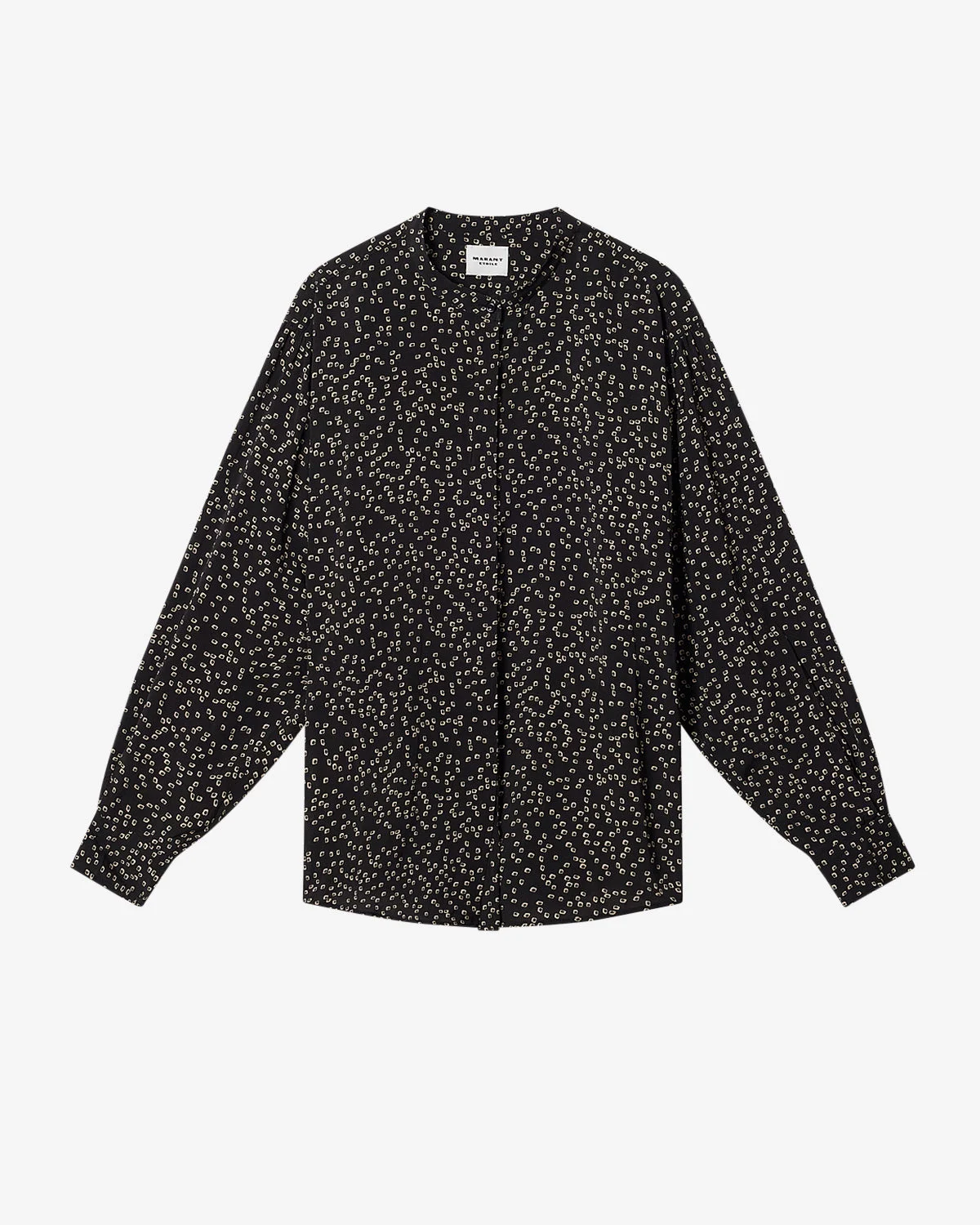 Flowing blouse style crepe shirt All-over blurry origami print Round neckline Long oversized sleeves with buttoned cuffs Gathered armholes Hidden buttons Flared cut and rear box pleat Style: CH0080FAD1J07E01BK CATCHELL 100% viscose Care & Sustainability Dry clean only For more details, see the instructions on the composition label