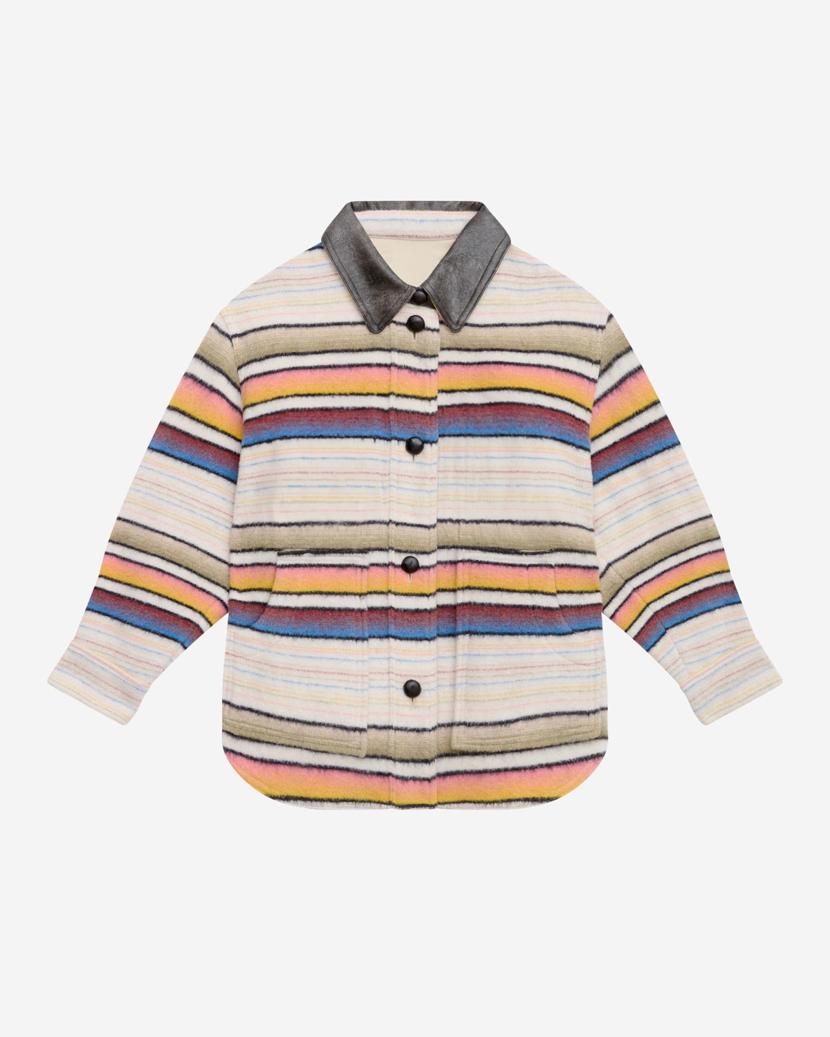 Striped wool blend overshirt coat Leather shirt collar Long sleeves Straight buttoned cuffs Buttoned front Patch pockets on the chest Patch pockets on the sides Rounded hem Unlined fabric Relaxed fit Style: MA0367FAC1D02E99MU DAYVI 74% wool, 23% polyamide, 3% other fibers