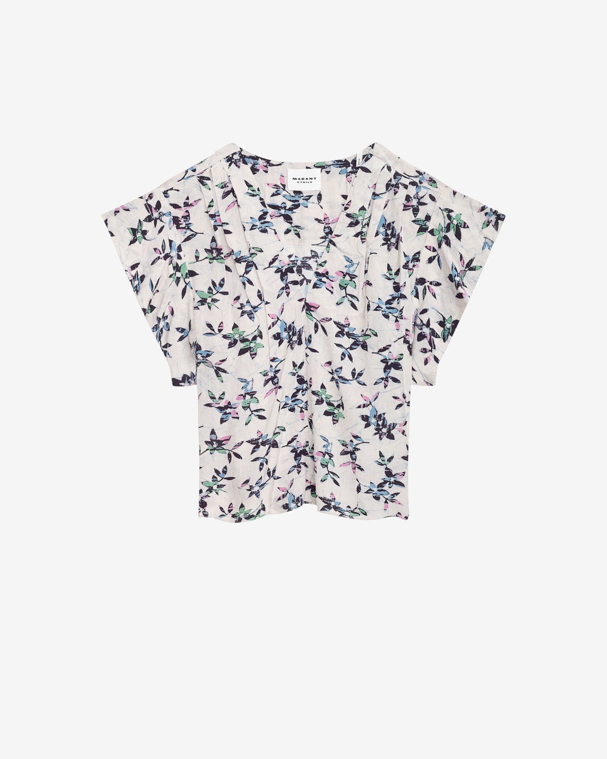 Printed flowing top Low-cut V-neckline Pleated front Loose armholes Short butterfly sleeves Fitted loose cut on the waist Style: HT0013FA-B3J01E DELOCIA 100% viscose