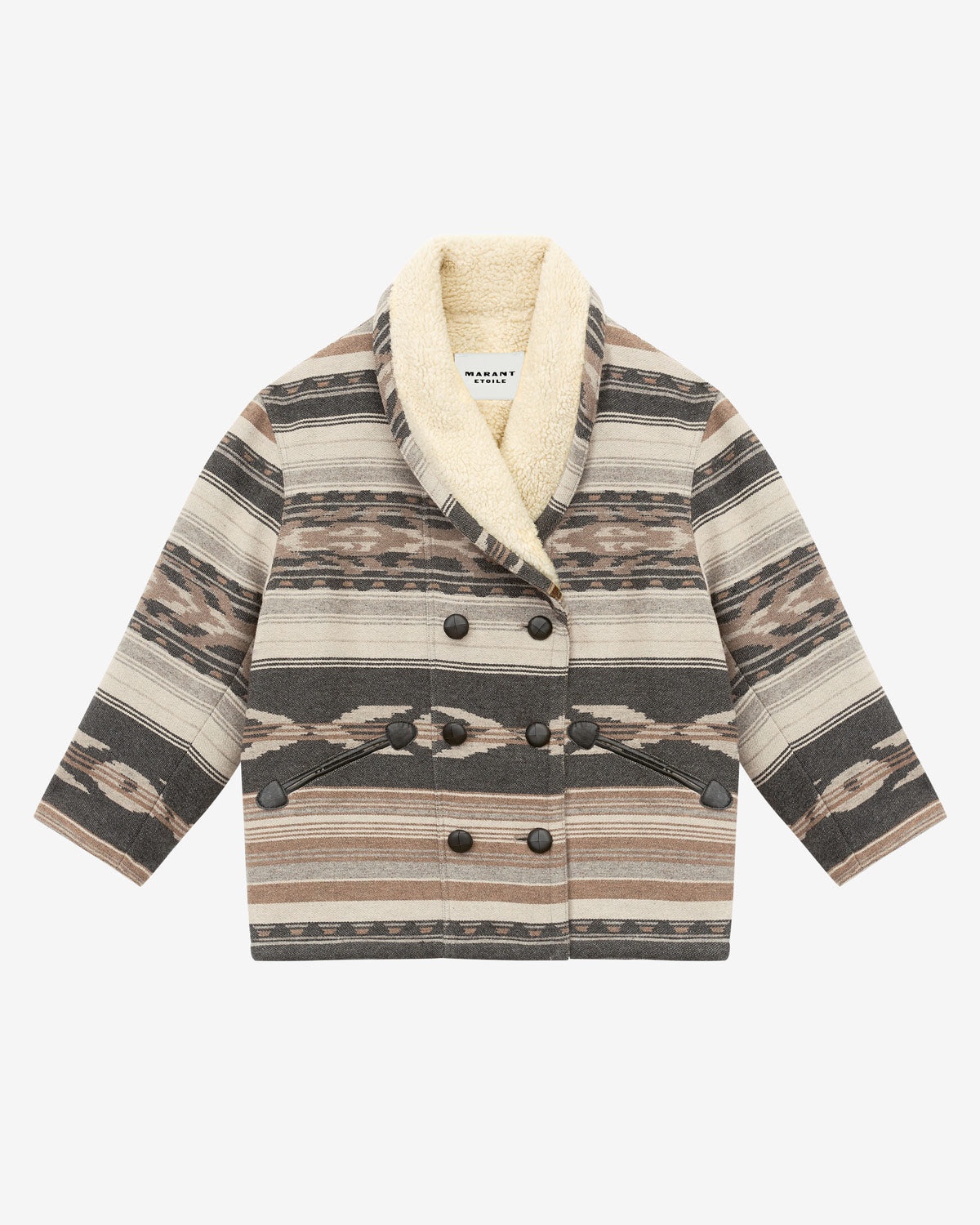 Wool blend coat with graphic style patterns Shawl collar with shearling style lapel Long sleeves Buttoned crossover front Piped side pockets with leather finishes Sheepskin style lining Medium length Style: MA0409FAC1D01E02FK DORCAS 58% wool, 18% polyester, 14% acrylic, 6% polyamide, 4% other fibers