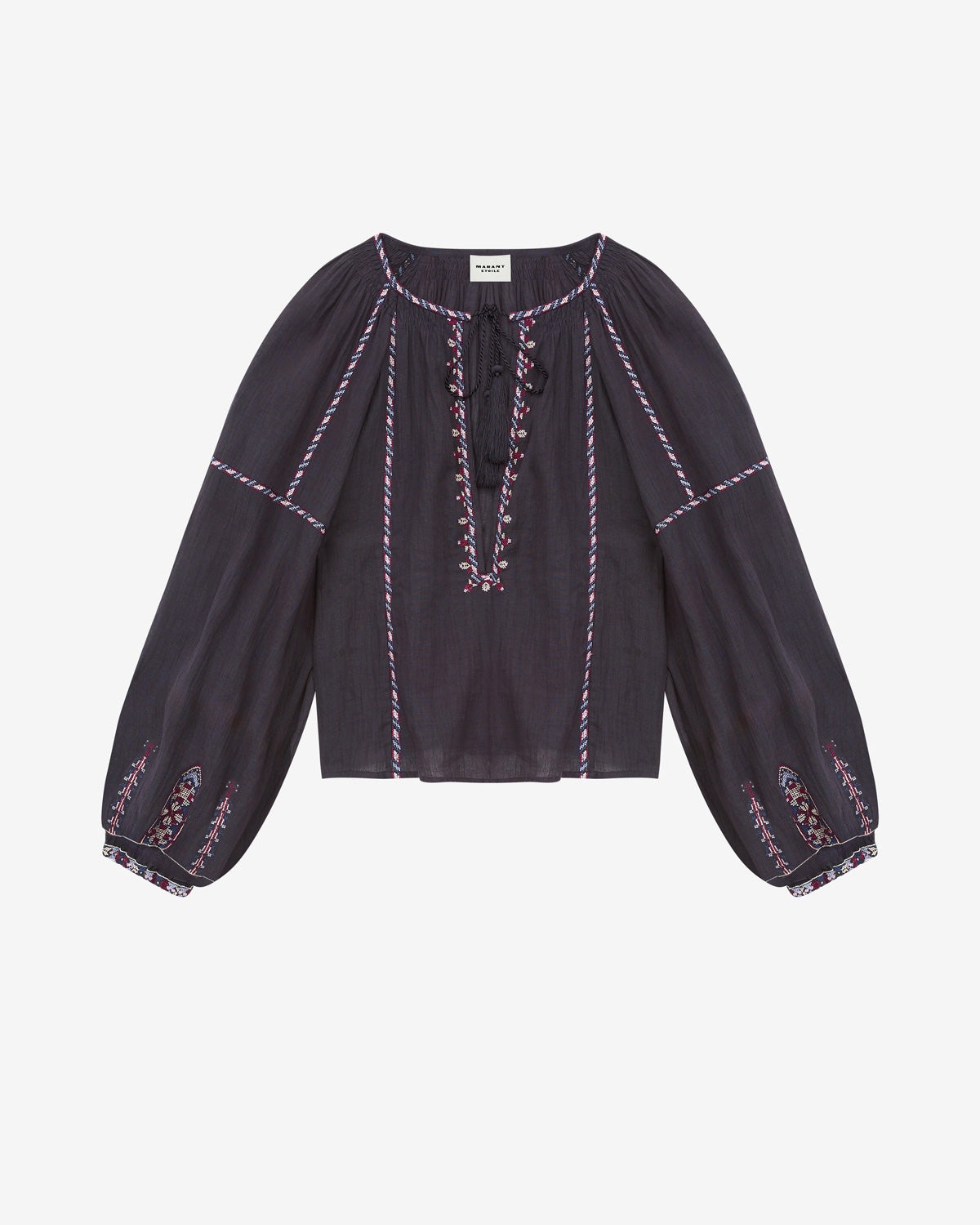 Gauze top with graphic style embroidery Round neckline with strings Strings with tassels Slit in front with hook Long raglan sleeves Tapered cuffs Rounded hem Flowing cut Style: HT0557FAC1J11EFNLI FERNANDA 100% cotton