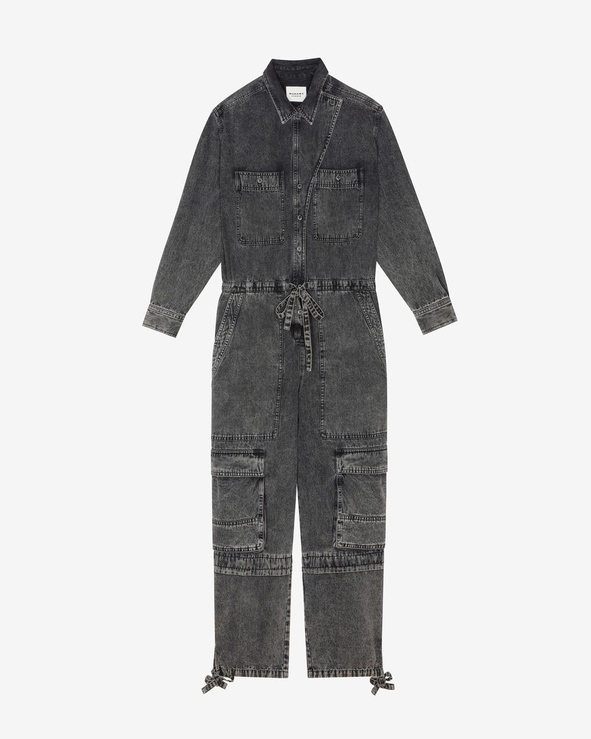 100% Cotton Black denim overall with long sleeves Chest and side and back pockets Flap pockets on legs Button closure Drawstring at the waist and ankles Reference : CB0028FA-B1H04E02FK