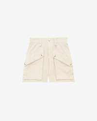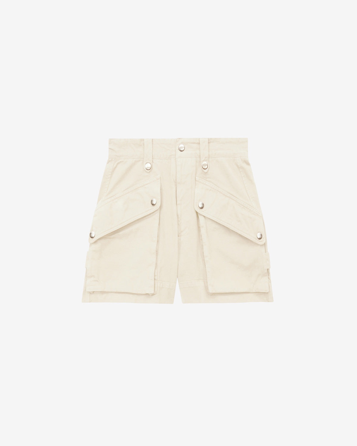 Workwear style shorts in plain-colored cotton Fitted waistband with snap-fastened loops Done up with a visible snap button and a zipper Gusseted side pockets with snap-fastened flaps Decorative tabs on the sides Zippered pockets on the back Silver metal details Cropped cut Style: SH0167FA-B3G02E JEMMY 100% cotton