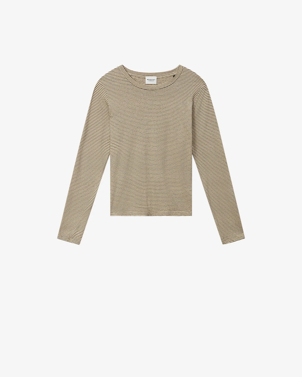 Cotton and linen T-shirt Striped pattern Round neckline Long sleeves Relaxed fit Style: TS0012FBD1N02EBKBE KAARON 93% cotton, 7% linen Care & Sustainability Cold hand wash with suitable detergent For more details, see the instructions on the composition label the history and environmental impact of this product