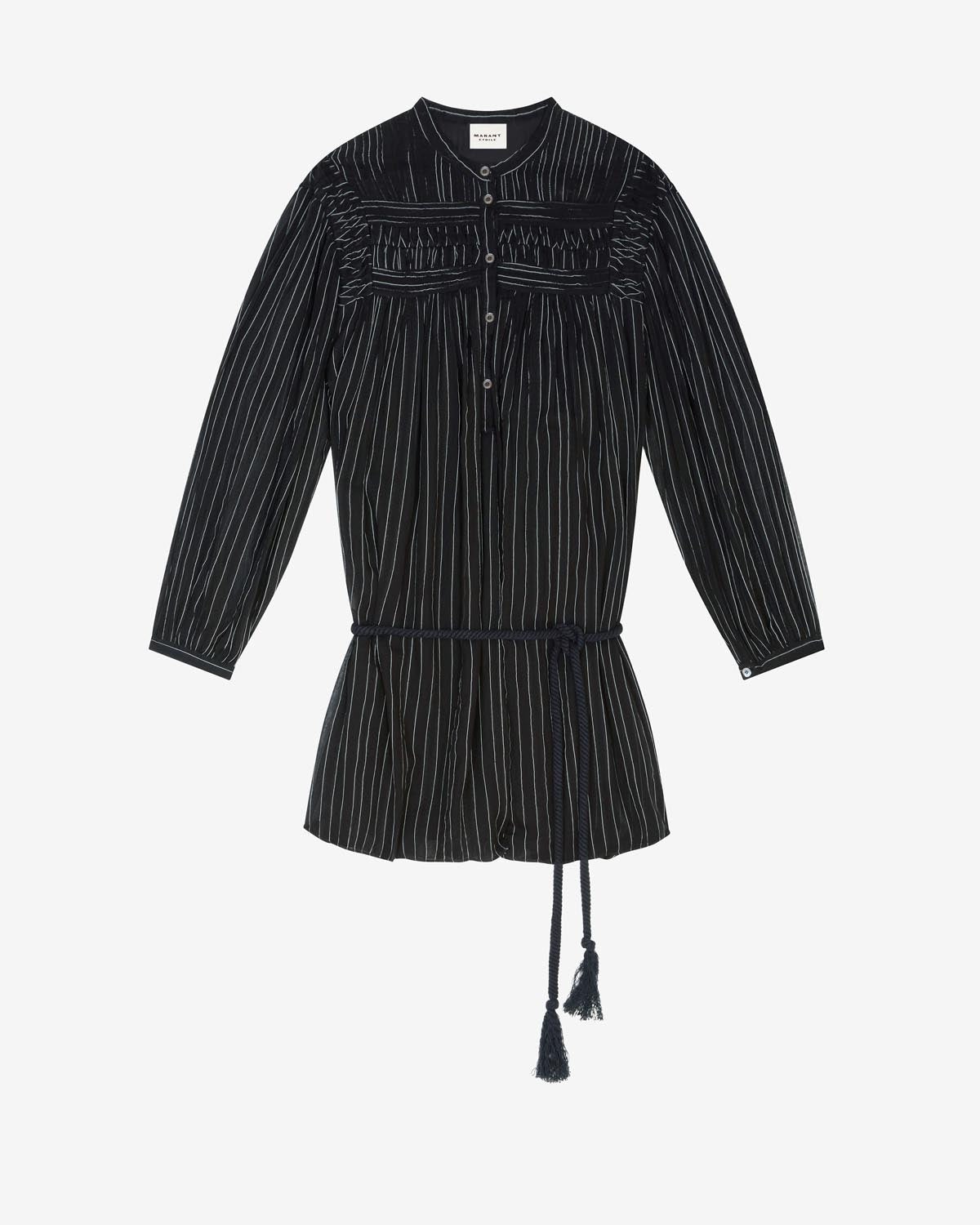 100% cotton Striped cotton short dress with puffed sleeves Button closure at front Gathers and pleats on front Removabe rope at waist Style: RO0337FAB1I04E02FK LEOZI