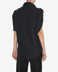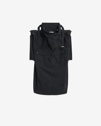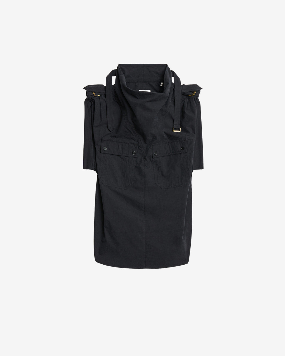 Sporty plain-colored crisp cotton top Stand-up collar with loops and a strap Short loose sleeves tightened with straps Silver-finish metal buckles Patch pockets with buttoned flaps on the chest Rounded hem Loose fit Style: HT0689FBC3G06E02FK NEMIA 100% cotton