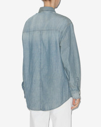 Cotton chambray shirt Shirt collar Long sleeves Straight buttoned cuffs Buttoned front Patch pockets with buttoned flaps Rounded hem Straight cut Style: CH0233FAC3G05E30BU OVELIA 80% cotton, 20% recycled cotton