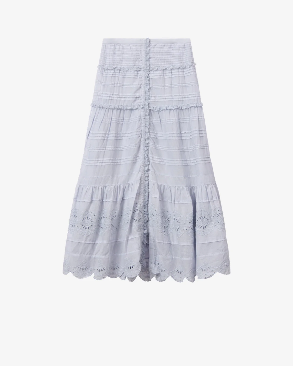Long lace and organic cotton skirt Elastic waist Button tab Pintucks and broderie anglaise Flared cut Style: JU0446FAD1J05EJ05E PAOLINE 100% cotton (1) Care & Sustainability Machine wash on a gentle cycle, inside out and at a maximum temperature of 30°C For more details, see the instructions on the composition label the history and environmental impact of this product