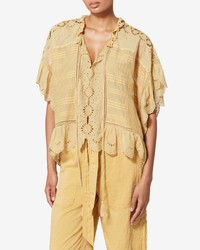 Caftan style organic cotton and floral lace top Round collar with tie strings Broderie anglaise and pintucks Short frilly sleeves Side frills and drawstrings Flared cut Style: HT0768FAD1J05E10LC PAYTON 100% cotton (1) Care & Sustainability Machine wash on a gentle cycle, inside out and at a maximum temperature of 30°C For more details, see the instructions on the composition label the history and environmental impact of this product