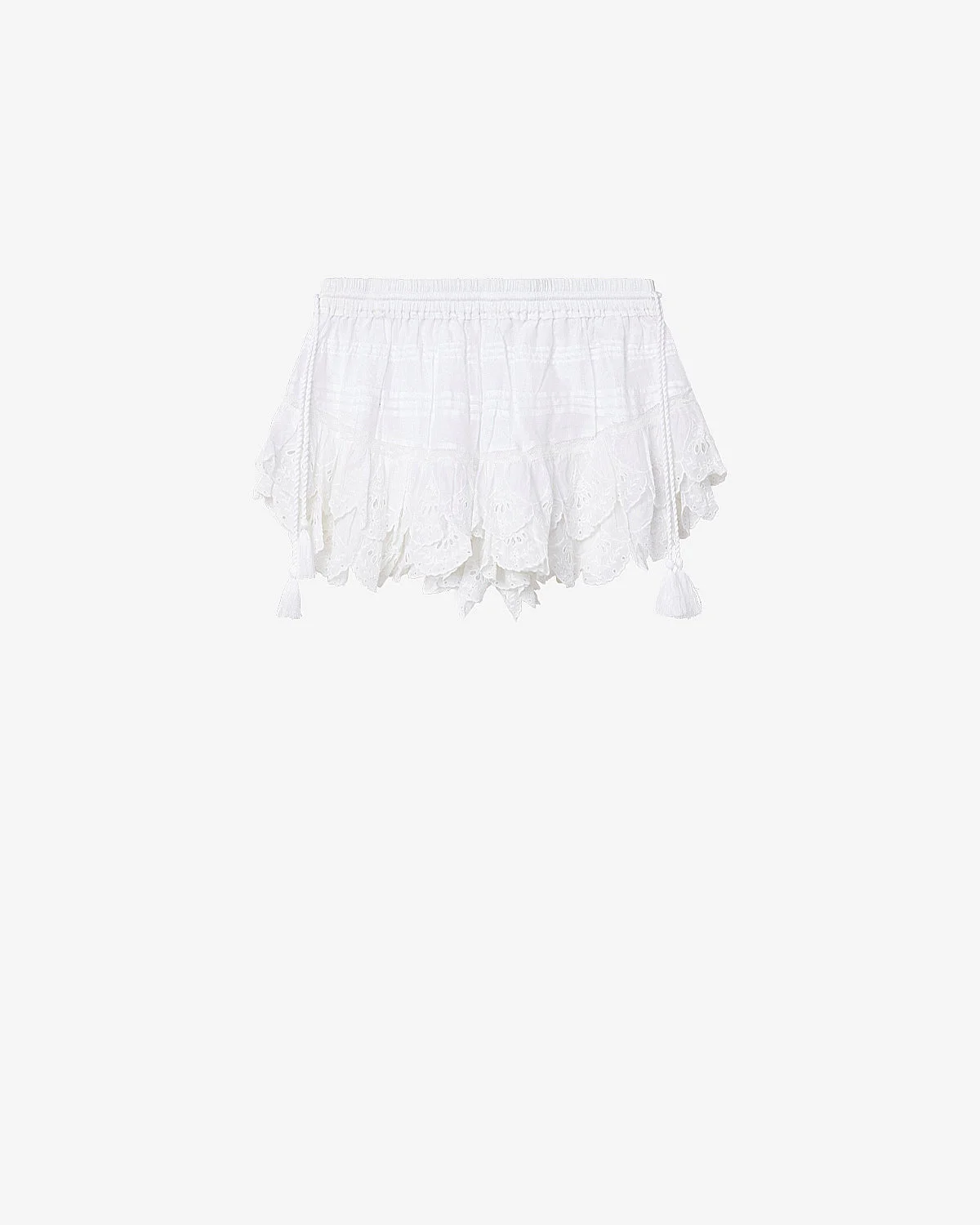 Short ruffled organic cotton and floral lace skort Tie strings with pompoms on sides of waist Pintucks and broderie anglaise Skater cut Style: SH0255FAD1J05E20WH PURIA 100% cotton (1) Care & Sustainability Machine wash on a gentle cycle, inside out and at a maximum temperature of 30°C For more details, see the instructions on the composition label the history and environmental impact of this product