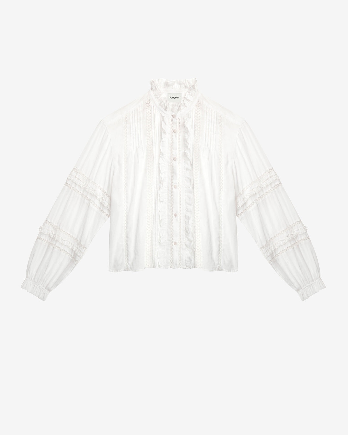 Plain-colored shirt in openwork cotton voile Frilly round collar Shoulder yokes Long sleeves Tapered cuffs Buttoned front Openwork lace details, pleats, and ruffles Relaxed fit Style: CH0201FAC1J15E20WH VALDA 100% cotton