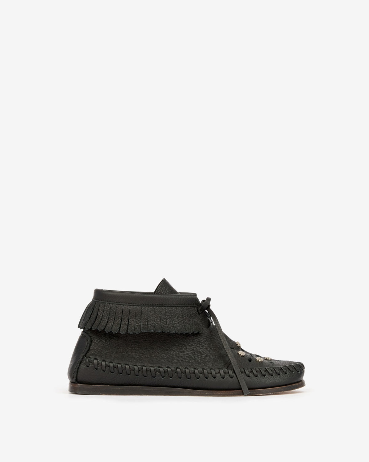 High-top loafers in full-grain leather Perforated round toes with metal flowers Laces Uppers with fringed finishes Edge adorned with soft braided leather Soft leather insoles and outsoles Soft leather lining Style: MC0025FAC1A24S01BK FELSA 100% bovine leather