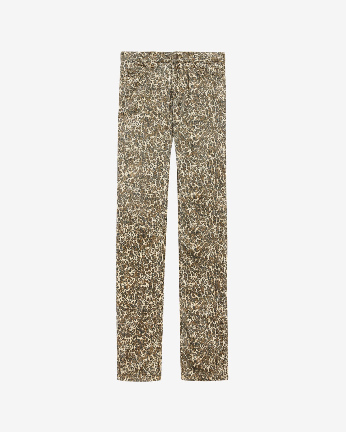 Leopard print corduroy pants Fitted waistband with loops 5 classic pockets Engraved metal button tab with a zipper Leather label in back with an "Isabel Marant" logo Metal rivets Medium-rise waist 98% cotton, 2% elastane