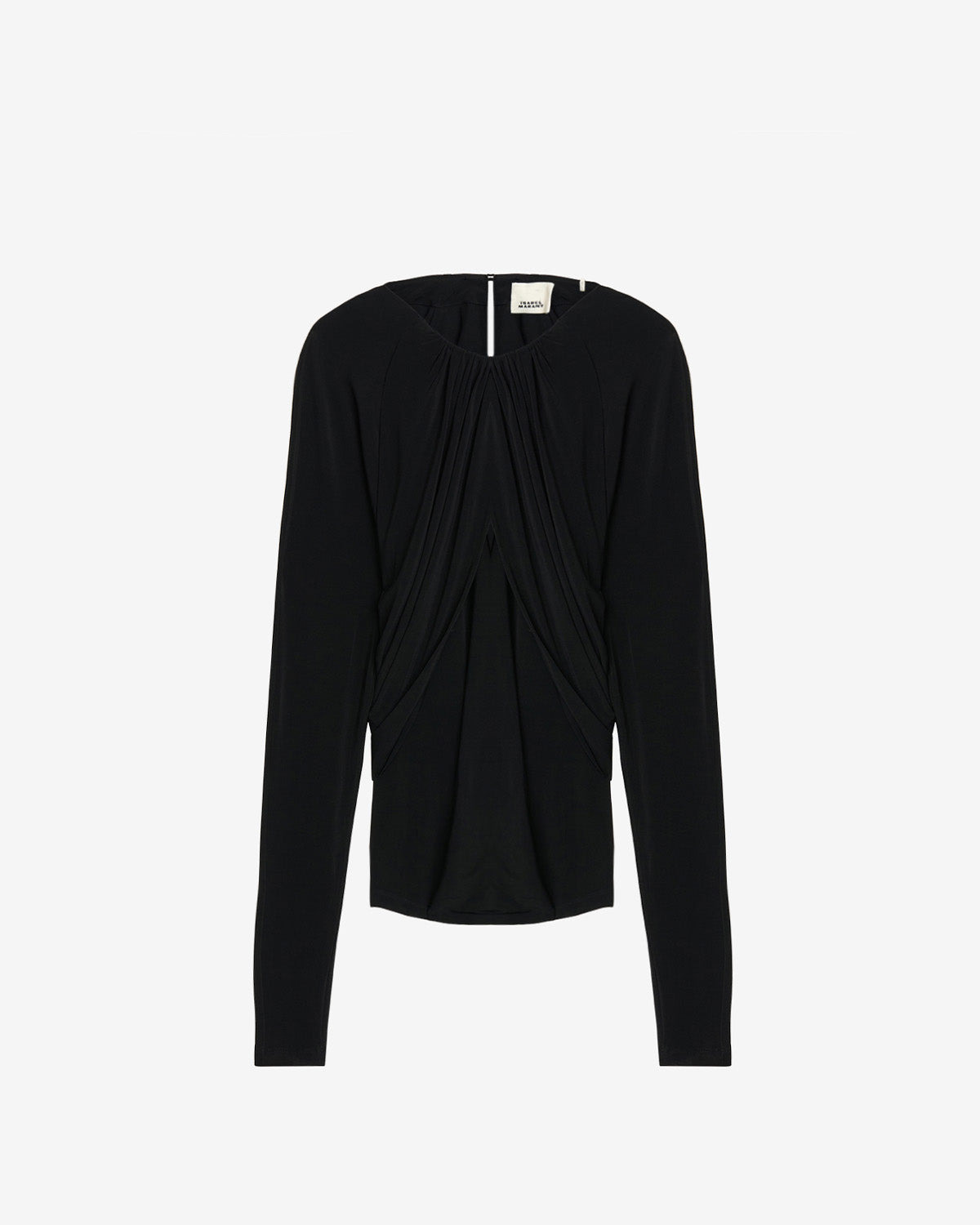 Draped plain-colored flowing jersey top Round neckline Draped yokes in front Long sleeves Fitted cut Style: HT0690FAC3K05I01BK GAETANE 92% viscose, 8% elastane