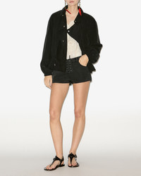Short jacket in satiny technical fabric Shirt collar Snap-fastened crossover front Long raglan sleeves Tapered elasticated cuffs Bib style front and back Fitted waist with drawstring Style: VE0514FAC2G01I01BK GWENOLA 65% tencel, 35% nylon