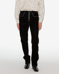 Fitted velvet jeans Fitted waistband with loops Done up with visible buttons 5 pockets Leather label in back with an embossed "Isabel Marant" logo Metal rivets and waist ring detail Contrasting topstitches Fitted cut Style: PA0614HA-C4H02H JEFFREY 97% cotton, 3% elastane