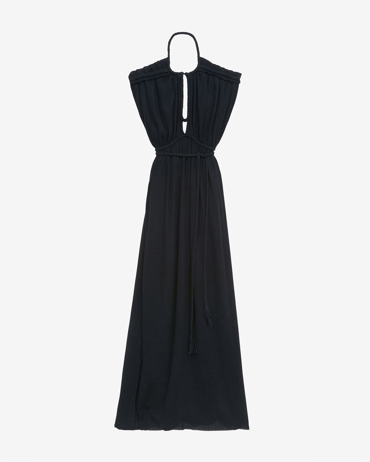 Flowing open back gathered cotton dress Buttoned round neckline Openwork in front Short sleeves Braided finishes Built-in braided cotton belt Flared skirt Side pockets Done up in back with a hidden zipper Long loose fit with a belted waist Style: RO0781FAC2J11I01BK JOYA 100% cotton