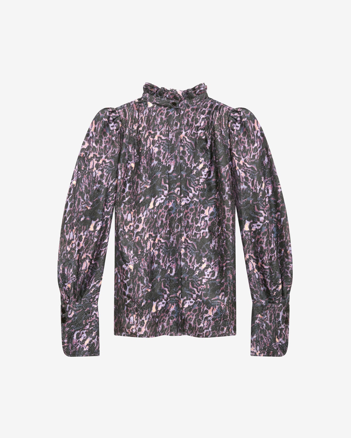 Printed flowing blouse Round collar with ruffled finishes Hidden buttons Structured padded shoulders Long blouse style sleeves Straight cuffs Straight and flowing cut Style: HT0493FA-B3J05I LAMIA 65% viscose, 35% silk