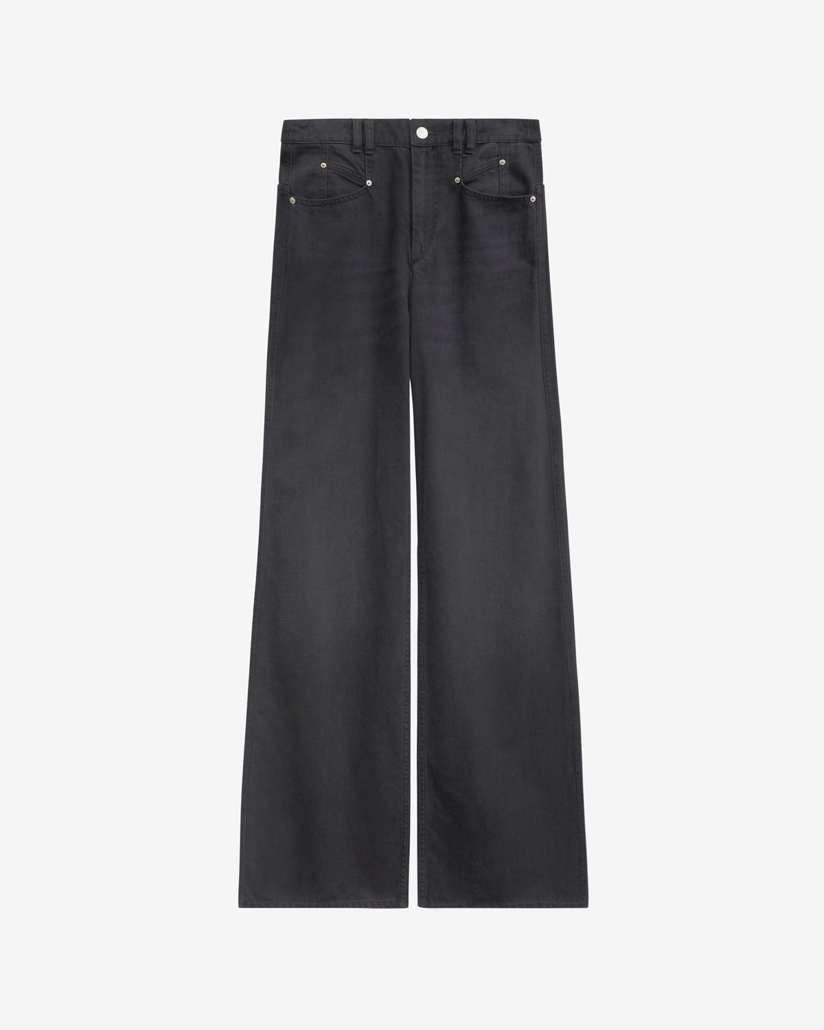 High-rise loose fit denim jeans Fitted waistband with double loops Engraved metal button tab with a zipper Side pockets Patch pockets on the back Leather label in back with an embossed "Isabel Marant" logo Metal rivets Silver-finish metal details Flared cut Style: PA0052FAB1H06I01BK LEMONY 100% organic cotton