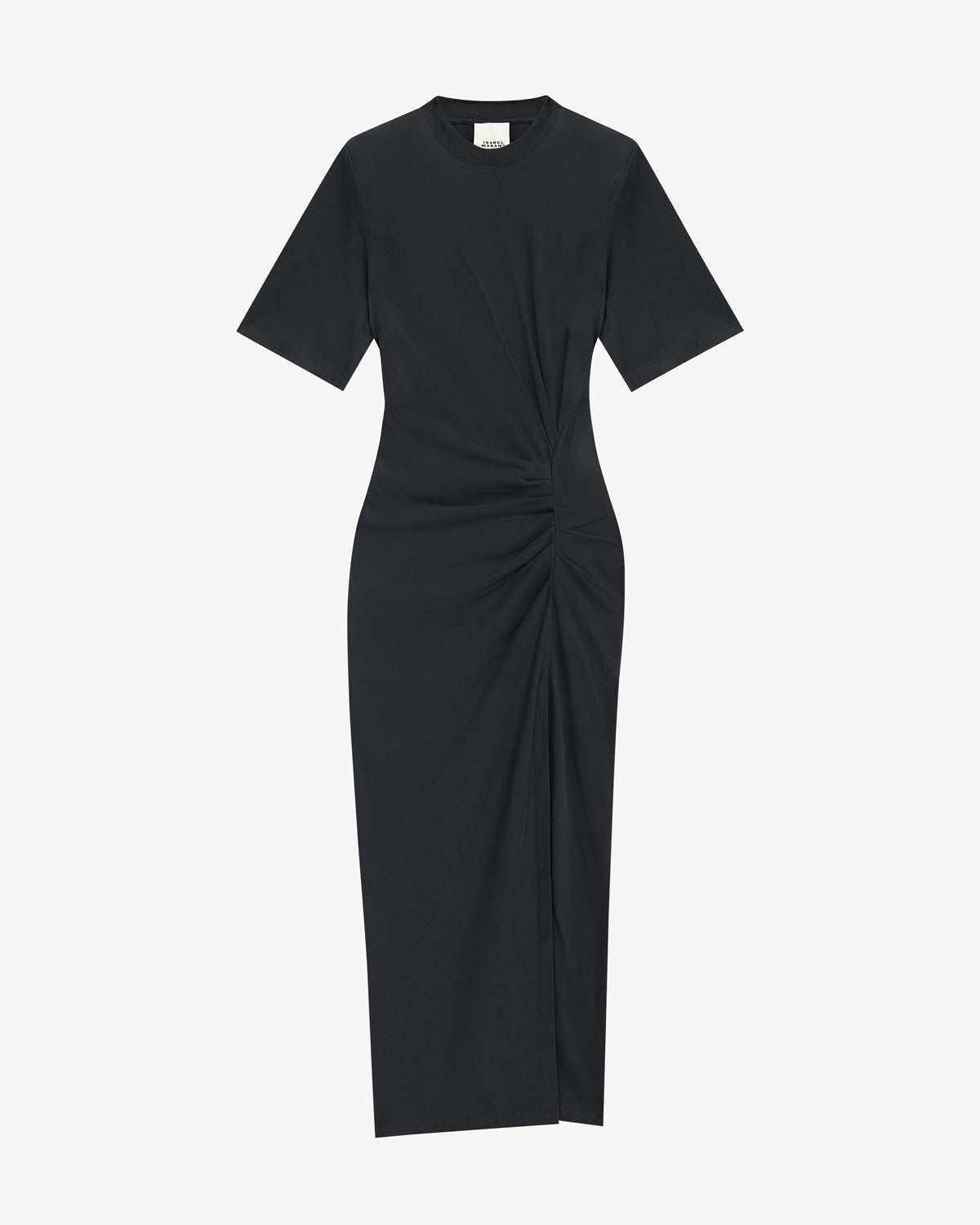 Plain-colored cotton midi T-shirt dress Round neckline with ribbed finishes Structured shoulders with pads Short sleeves Asymmetrical draped style pleats Slit on the front Straight cut with a fitted waist Style: RO0523FA-A1N41I LEXIA 100% cotton