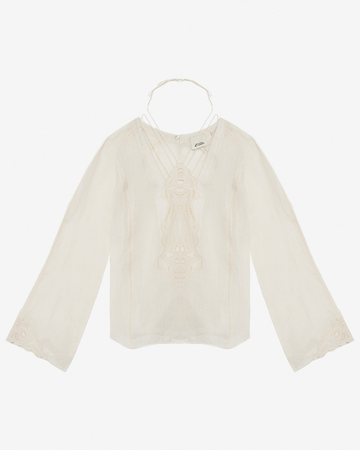 Embroidered ramie blouse Low-cut V-neckline Embroidered neckline yoke Neck ties Done up at the neck with a buttoned slit Long flared raglan sleeves Embroidered cuffs Rounded hem Straight cut Style: HT0629FAC2J08I23EC LUNA 100% ramie