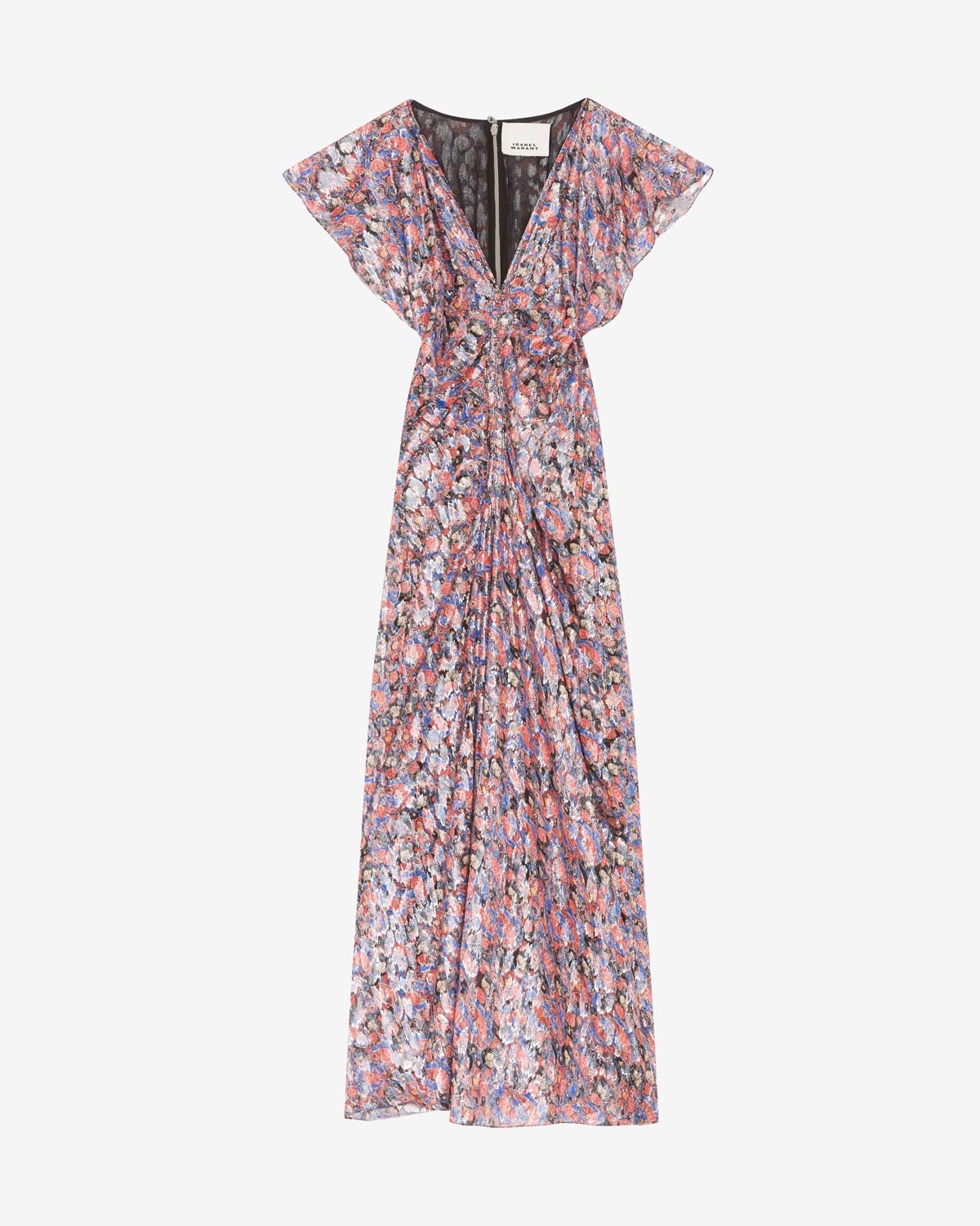 80% viscose, 20% polyester Long, pleated, printed short-sleeve dress V-neck Iridescent effect Frilly shoulder cut-outs Done up with a zipper Unlined Style: RO0229FB-B2J05I LYNDSAY