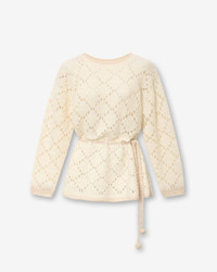 Hand-crocheted openwork mohair sweater dress Round low-cut rear neckline Long sleeves Crochet drawstring with pompom on the waist Flowing cut Style: PU0820FA-C4L02I MERIDA 38% polyamide, 32% wool, 30% mohair