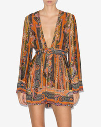 Short belted printed silk dress V-neckline trimmed with studs and metal eyelets Long sleeves Matching tie belt Skirt with pleated waist Plain-colored crepe lining Relaxed fit Style: RO0805FAC2J15I11OR MORGANE 100% silk