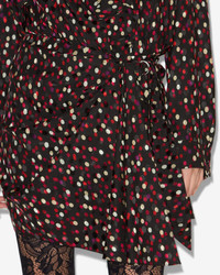 Short silk shirt style polka dot print dress Asymmetrical buttoned front and belt with buckle on the draped side in front Stand-up pussy bow style collar with buckle Long sleeves Flowing asymmetrical cut Style: RO0921FB-C4J02I ORA 90% silk, 10% elastane