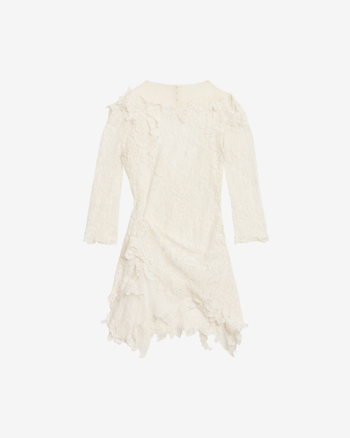 Lace dress Lace braids on the sleeves, collar, and hem Draped skirt with lace Tulle neckline yokes 3/4 sleeves Rear seam with fine lace yokes Sold with a slip Style: RO0995FA-C4J07I RUBIANA 70% viscose, 30% silk
