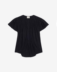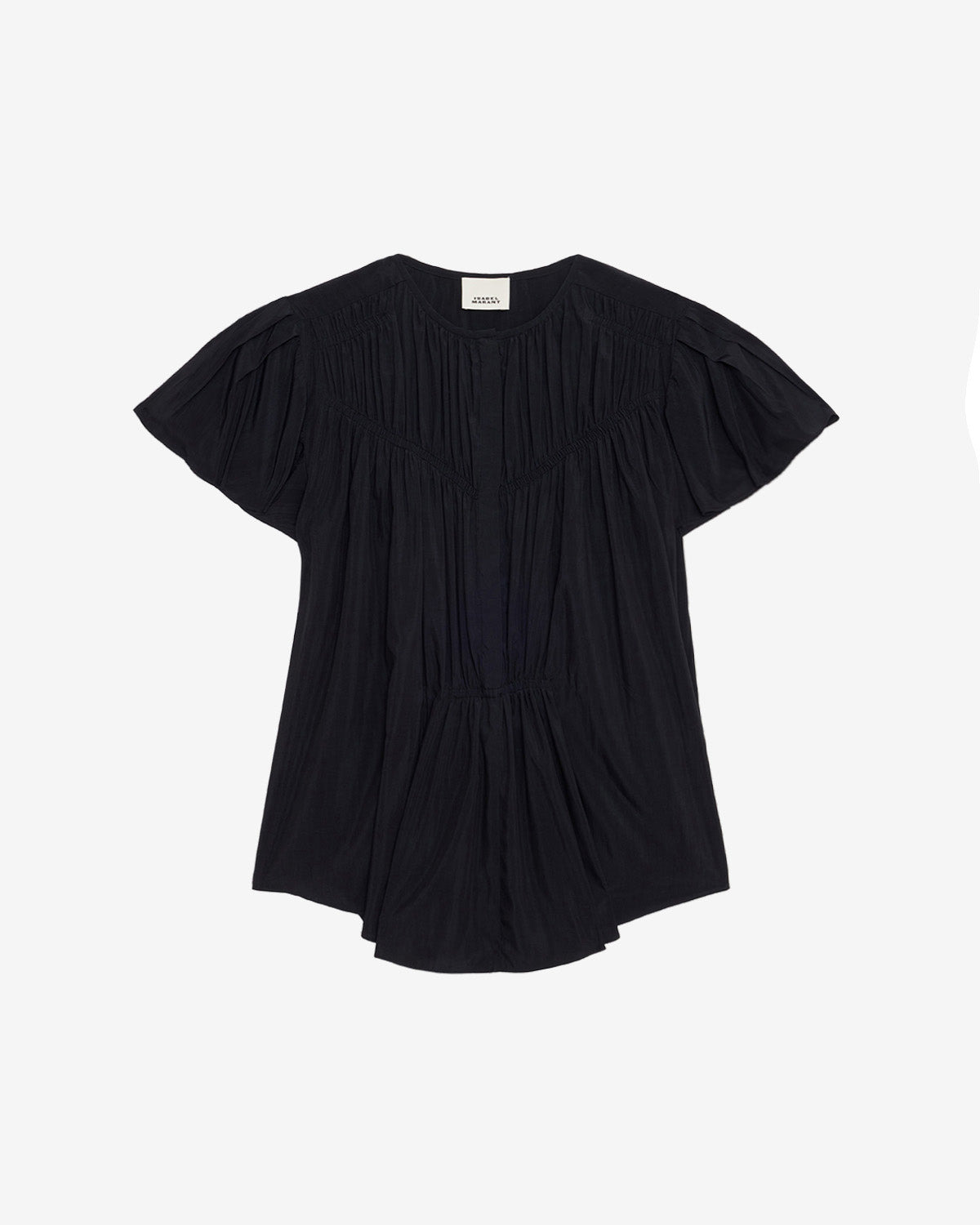 Gathered flowing top Round neckline Done up in front with hidden buttons Gathered front and back Short flared sleeves Flared cut Style: HT0722FBC3J09I01BK SYNDA 75% modal, 25% polyamide