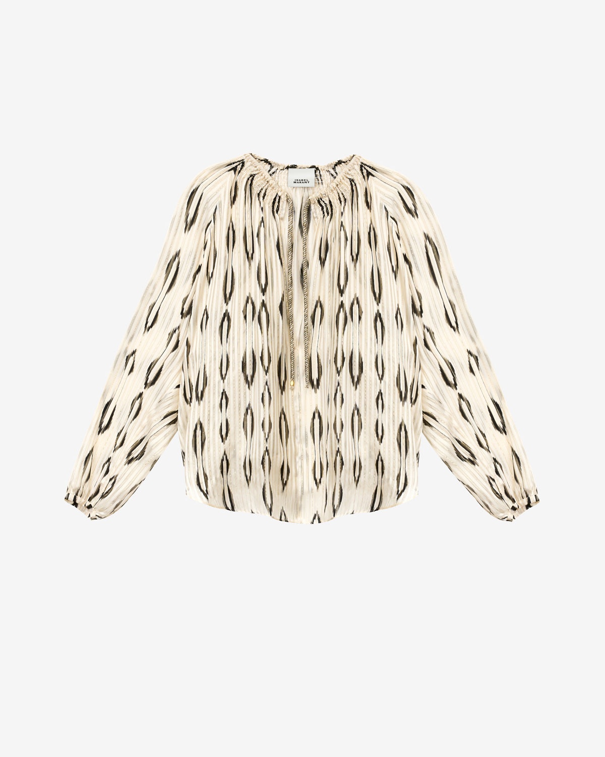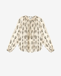 Silk blouse with graphic style Lurex patterns Round neckline with string Slit with hooks Long sleeves Tapered buttoned cuffs Loose fit Style: HT0611FAC1J16IBKEC SYRA 97% silk, 3% polyester