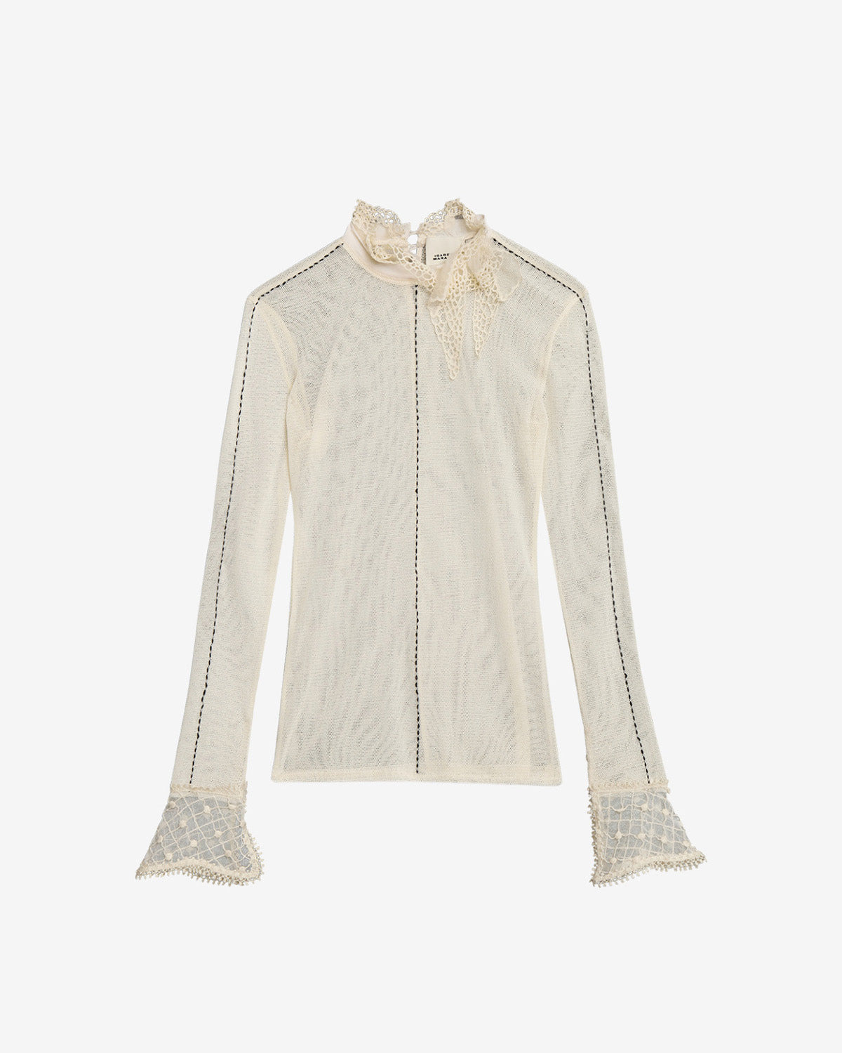 Long-sleeve tulle style mesh top Round neckline with organza frill Long sleeves with lace finishes Contrasting hand-stitched finishes Fitted cut Style: HT0729FA-C4N04I23EC 78% polyester, 20% rayon, 2% elastane