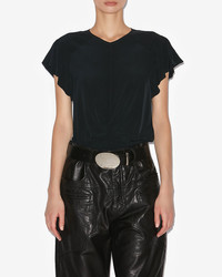 Plain-colored pleated top Round neckline Short frilly sleeves Pleated front Done up in back with a button and a hidden zipper Rounded hem Flowing cut Style: HT0356FDB1J12I01BK TULLYA 100% viscose
