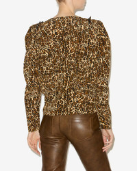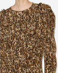 Pleated blouse in leopard print silk Round neckline with slit Done up in front with a metal hook Shoulder pleats Long gigot sleeves Buttoned cuffs Flowing cut Waist highlighted by a wide fitted waistband 91% silk, 9% elastane