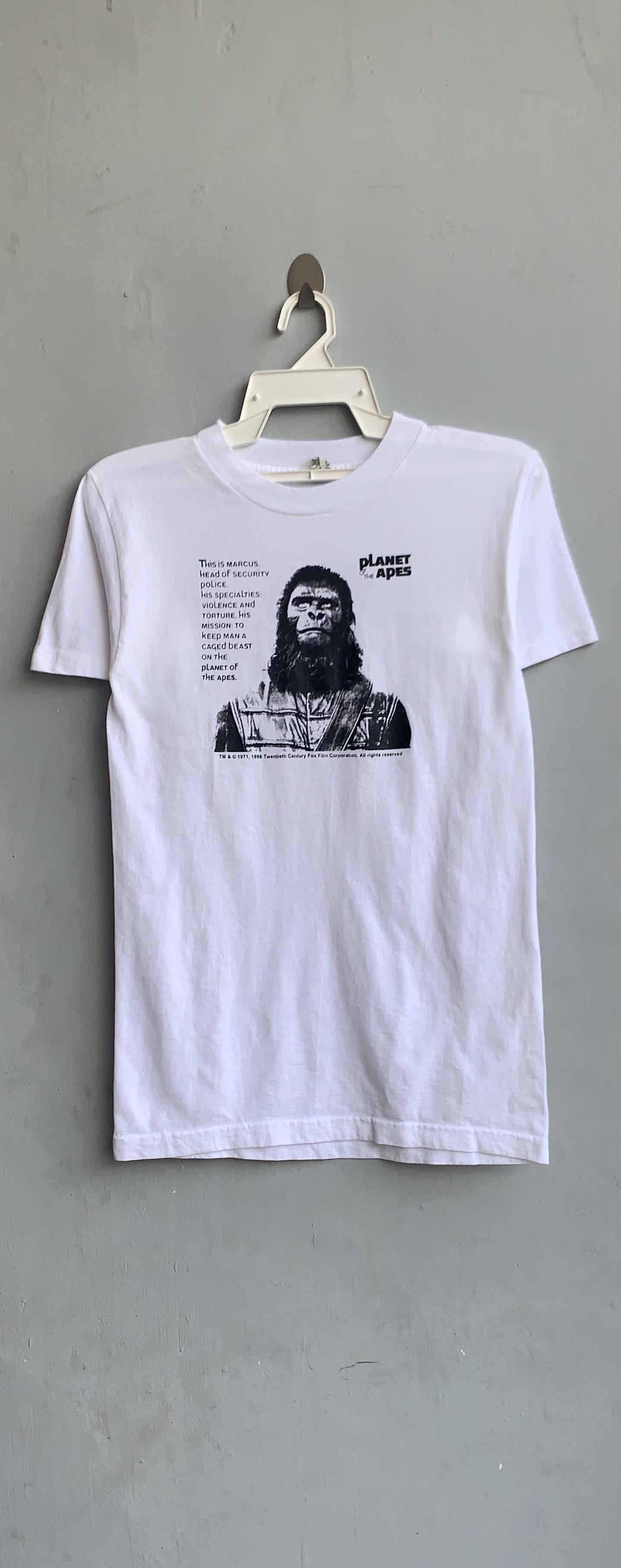Vintage 1971 Movie Planet Of The Apes Tee Size on tag : S Brand : Mosquitohead Armpit to armpit : 17" Top to bottom : 27" Material : 100% Cotton Colour : White Condition : GOOD CONDITION Stich: all single