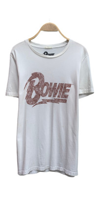 David Bowie Band Tee Size on tag : L Brand : David Bowie / GU Armpit to armpit : 19.5" Top to bottom : 26.5" Material : 100% Cotton Colour : White Condition : GOOD CONDITION (have stain) Stich: all double