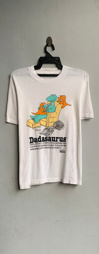 Vintage ‘87 ‘Dad-A-Saurus’ Tops Cartoon Dinosaur Tee Size on tag : missing tag Brand : Dadasaurus Armpit to armpit : 20.5" Top to bottom : 26.5" Material : 100% Cotton Colour : White Condition : GOOD CONDITION Stich: all single