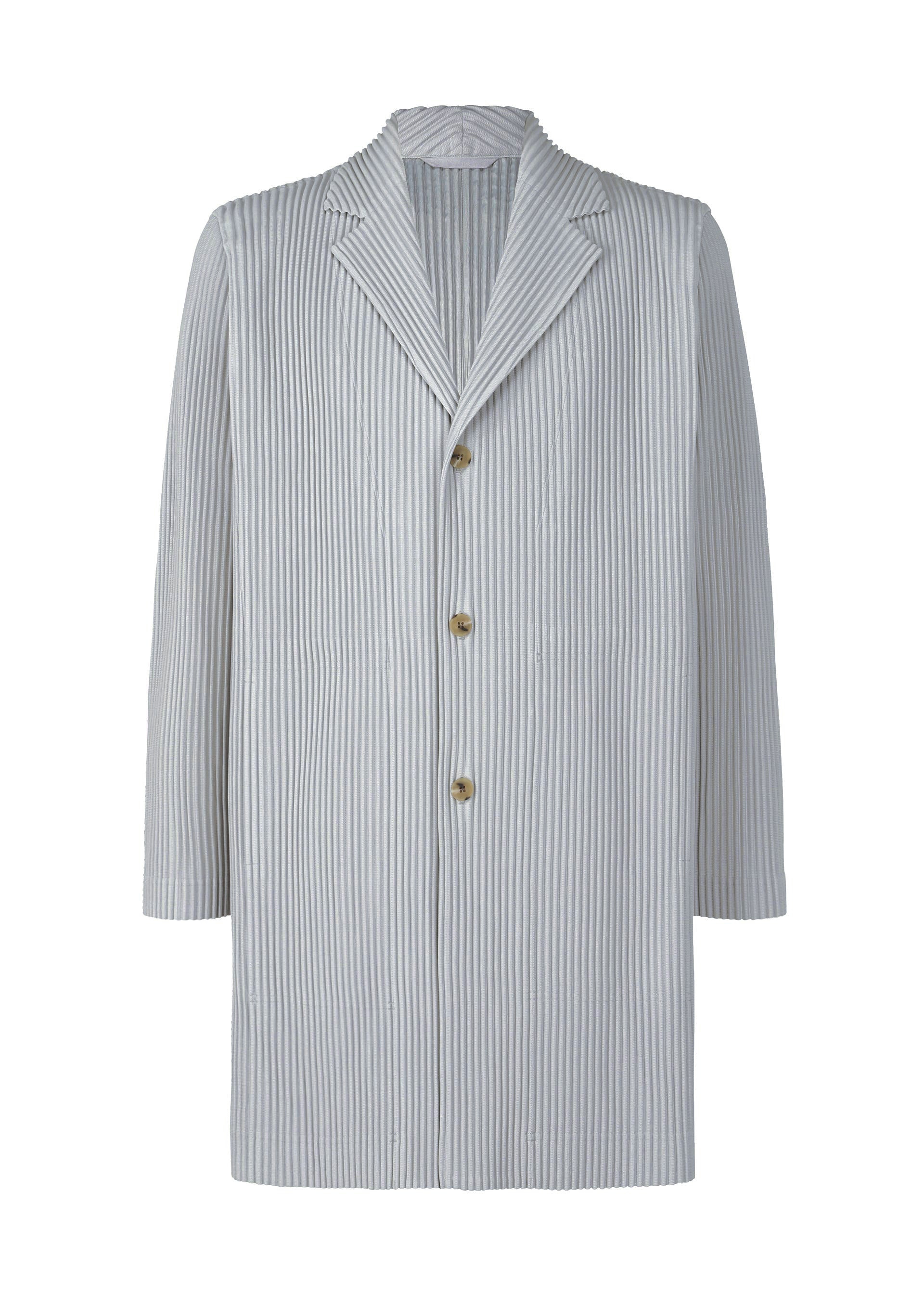 A long jacket that dries quickly, which is unique to polyester material, and is portable and lightweight. A three-dimensional form is achieved by further sewing after pleating. Product Information Material: 100% polyester Lining: 100% polyester neckline/collar:tailored collar Front opening:button Pocket (position):both sides Vent (position):center vent その他:内ポケット 襟吊り