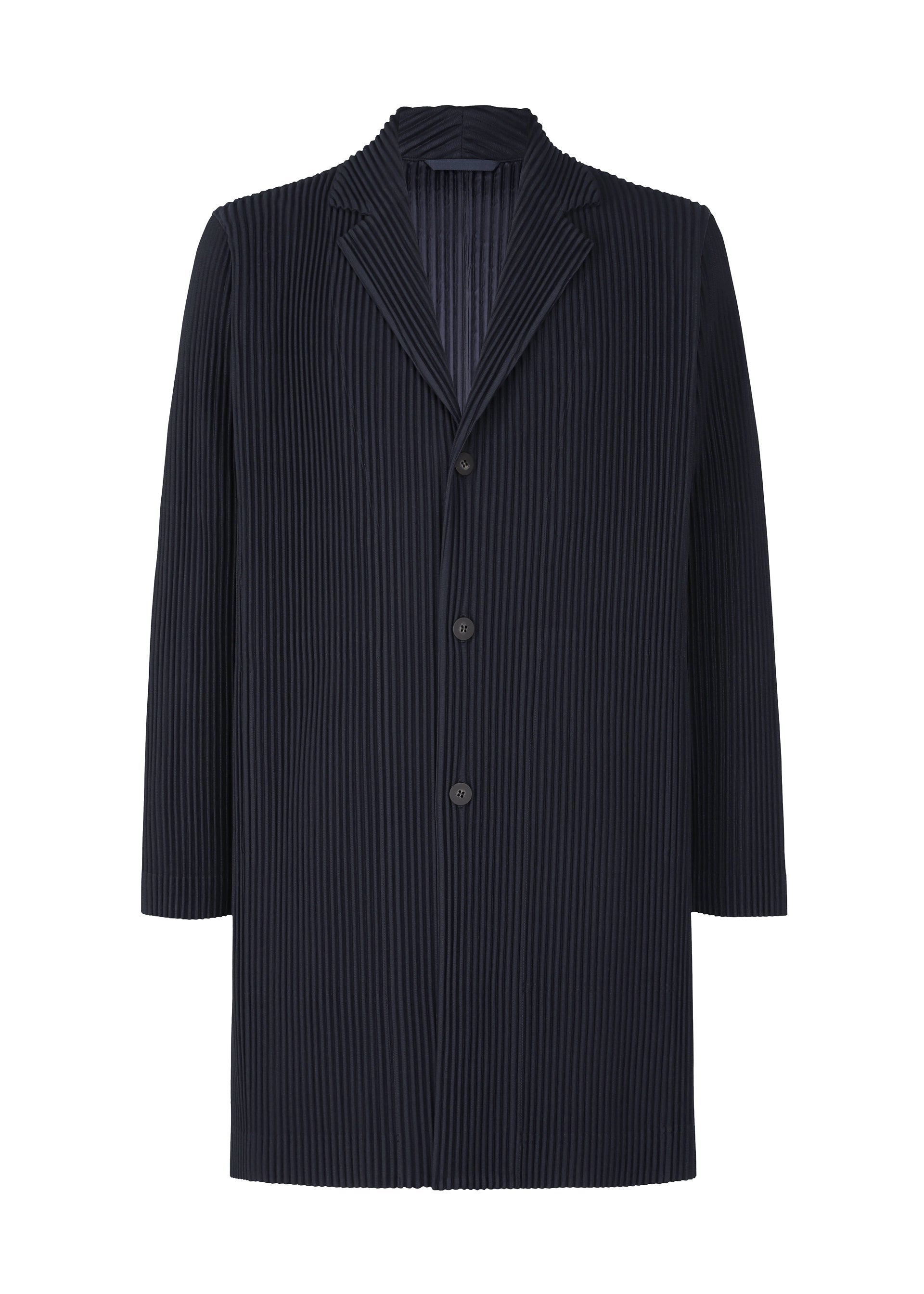 A long jacket that dries quickly, which is unique to polyester material, and is portable and lightweight. A three-dimensional form is achieved by further sewing after pleating. Product Information Material: 100% polyester Lining: 100% polyester neckline/collar:tailored collar Front opening:button Pocket (position):both sides Vent (position):center vent その他:内ポケット 襟吊り