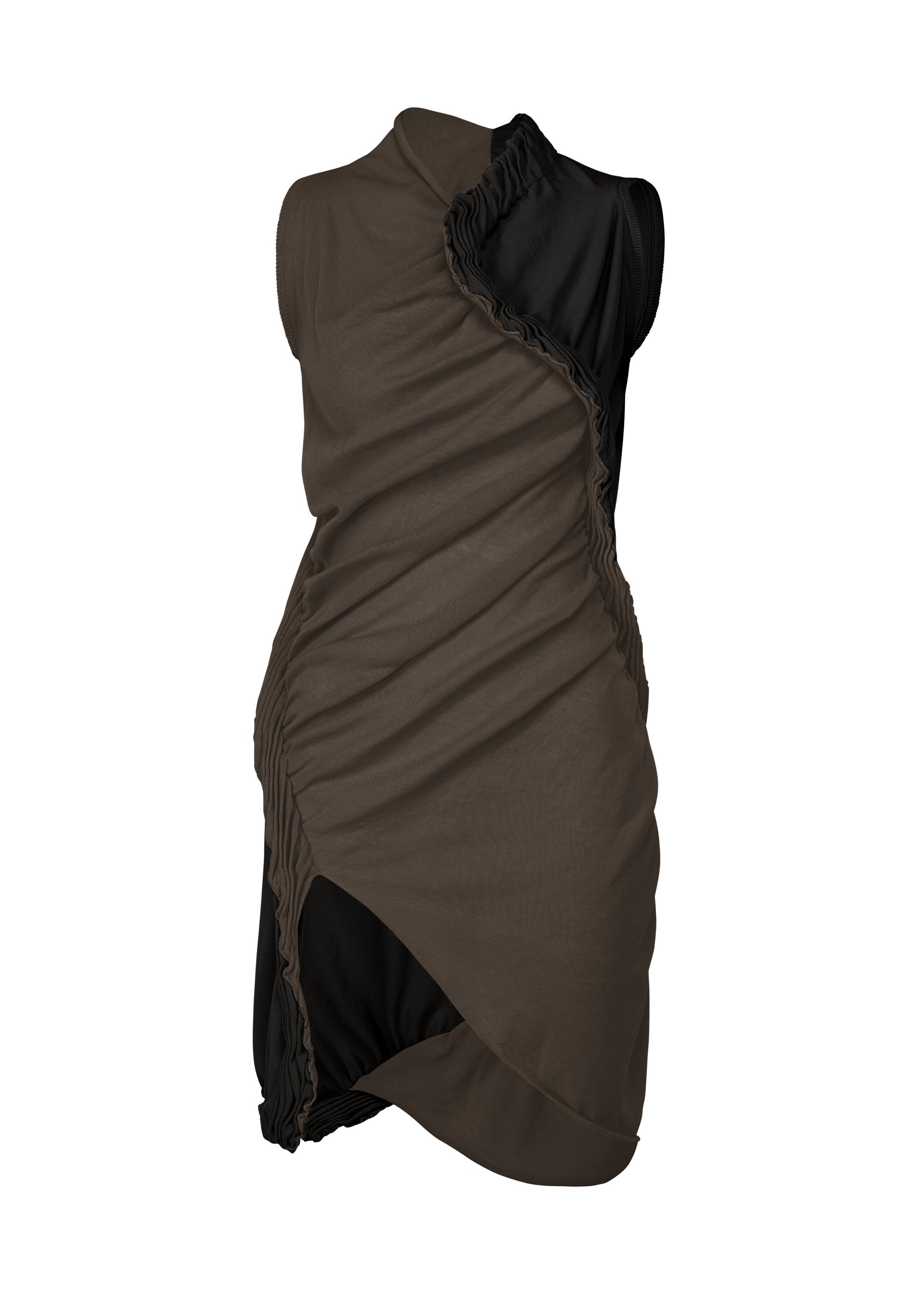 This non-sewn knit tunic uses a double-knitting technique for the organic form inspired by the vitality of plants. It is knit on the front and back by alternating two types of thread made from S-twist cotton and recycled polyester. Due to the characteristics of the S-twist thread, the knit fabric twists in a spiral, and the double-knitted areas form wrinkles, creating a design that resembles plant vines stretching toward the sky. Product Information Material: 62% cotton, 38% polyester Country of origin: Japan
