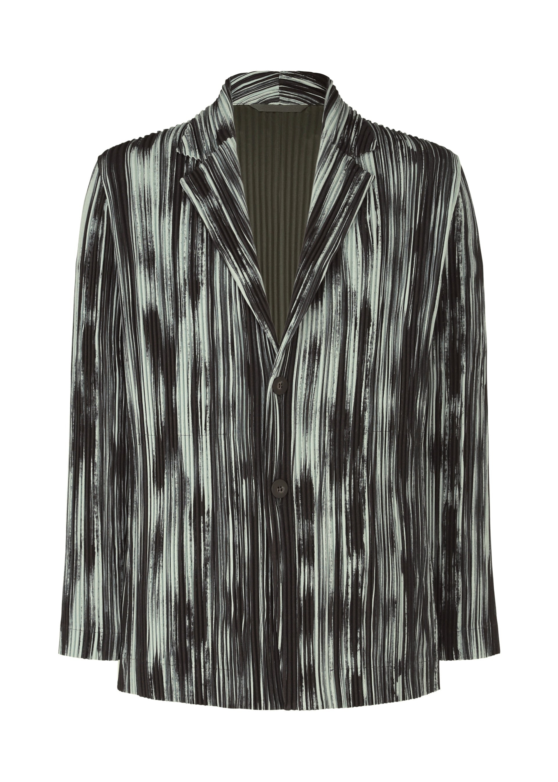 This jacket is characterized by its design inspired by the naturally unplanned stripe patterns of stone. You can enjoy the dignified jacket style made with material featuring a soft, supple texture despite being polyester. It has pockets on both sides, inner pockets, and a center vent at the back. Product Information Material: 100% Polyester, Lining: 100% Polyester Made in the Philippines Neckline / Collar:Tailored collar Front opening:button Pocket (position):Both sides Vent (location):Center vent others:Inner pockets (both chests) Collar strap