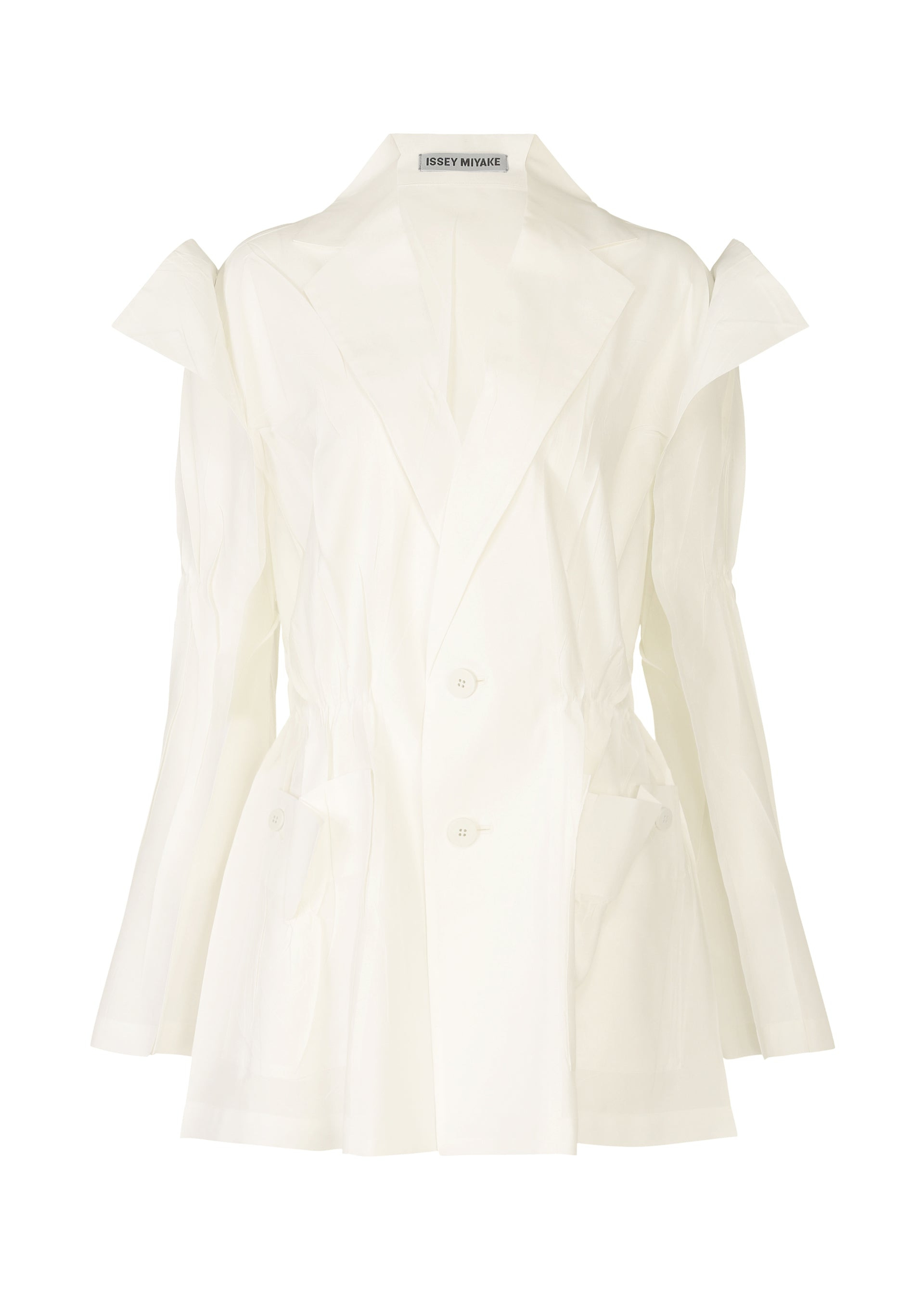 This tailored jacket has a unique texture with wrinkles like paper. The sleek fabric that does not cling to the skin is made from a combination of polyester and cotton voile, with polyurethane threads that are woven in jacquard in some areas and shrunk. Further pressing the fabric to flatten it creates unpredictable wrinkles. Due to the manufacturing process, the texture and size of this product vary from item to item. Please note this in advance.