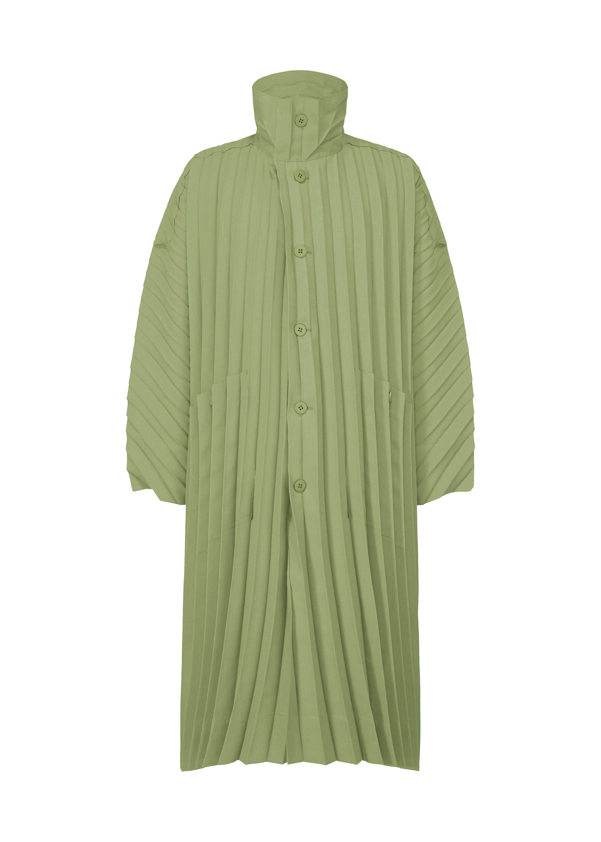 This long coat is made from highly-dense woven polyester material with a hand-pleated finish. It is characterized by its curved pleat lines, evoking a sense of the flow of wind. It has pockets on both sides and a center vent on the back. Product Information Material: 100% Polyester Country Of Origin: Philippines Neckline/Collar:High Neck Front Opening:Button Pocket (Position):Both Sides Vent (Position):Center Vent Other:Collar Hanging