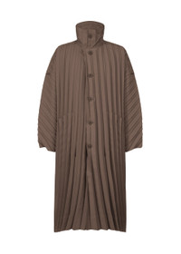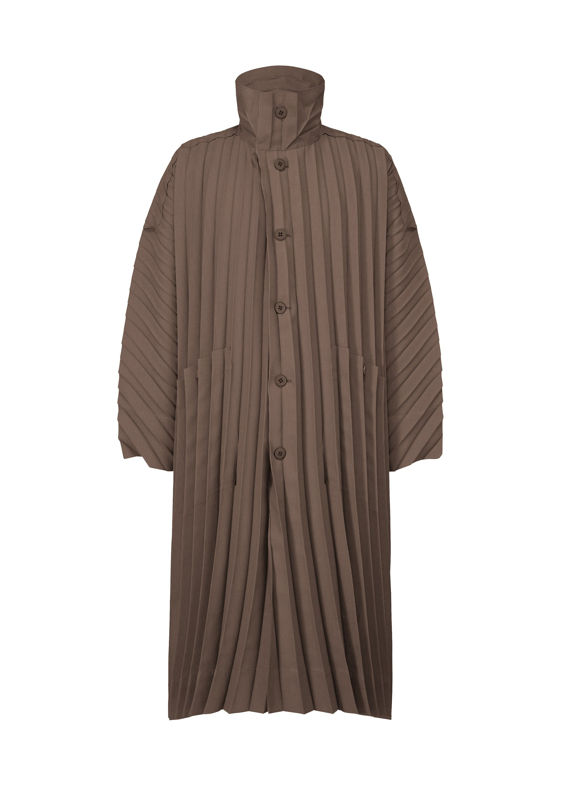 This long coat is made from highly-dense woven polyester material with a hand-pleated finish. It is characterized by its curved pleat lines, evoking a sense of the flow of wind. It has pockets on both sides and a center vent on the back. Product Information Material: 100% Polyester Country Of Origin: Philippines Neckline/Collar:High Neck Front Opening:Button Pocket (Position):Both Sides Vent (Position):Center Vent Other:Collar Hanging