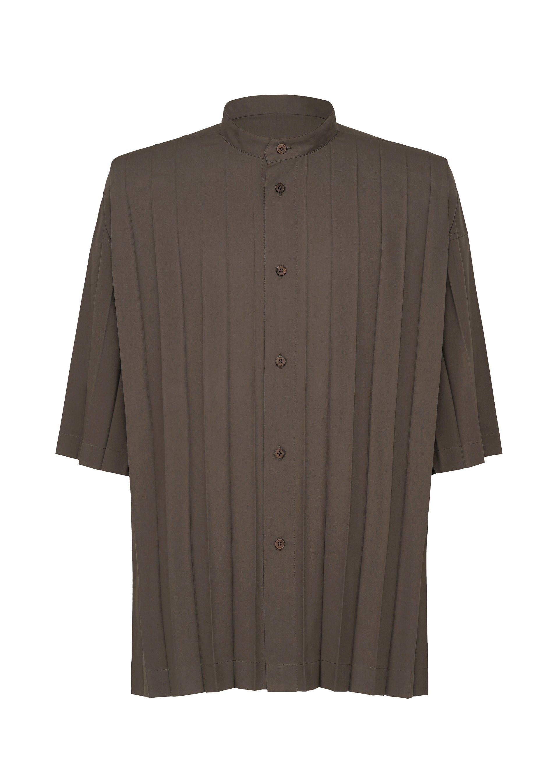 This shirt with a standing collar is made from thin polyester fabric with a hand-pleated finish. There are slits on both sides.