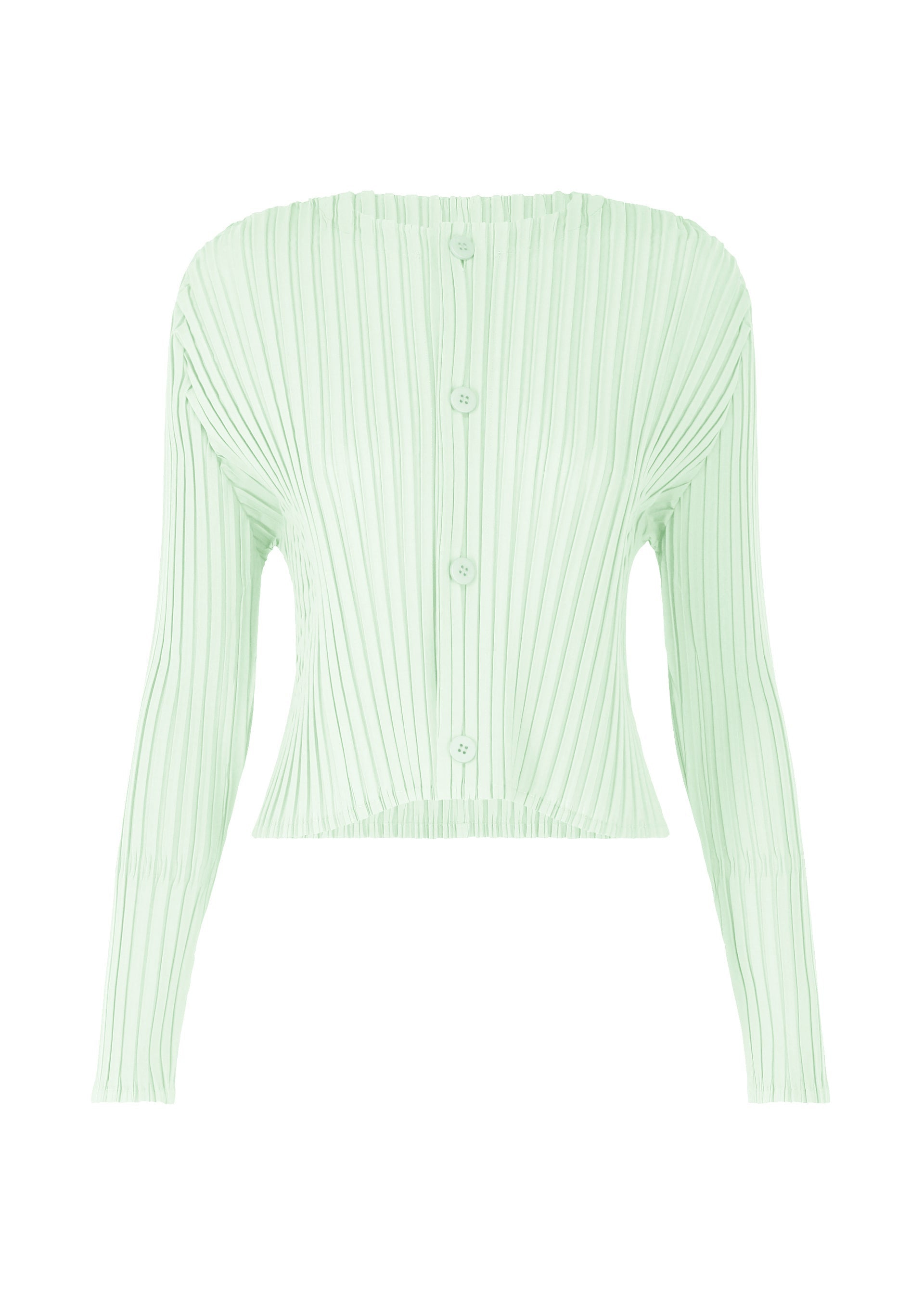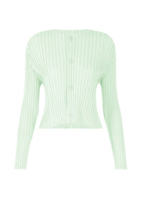 This cardigan is characterized by its three-dimensional, dynamic form created through adding folds and pleating. Bold folds and machine pleating give the folds structure and create a fresh silhouette. Made from tightly twisted polyester, the cardigan has a crisp texture with a moderate sheerness for a light feel. Its elegant design also makes it suitable for special occasions. The size of this product varies slightly from item to item. Please note this in advance. Product Information Material: 100% polyester Made in Japan Neckline / Collar:No collar / crew neck Front opening:button