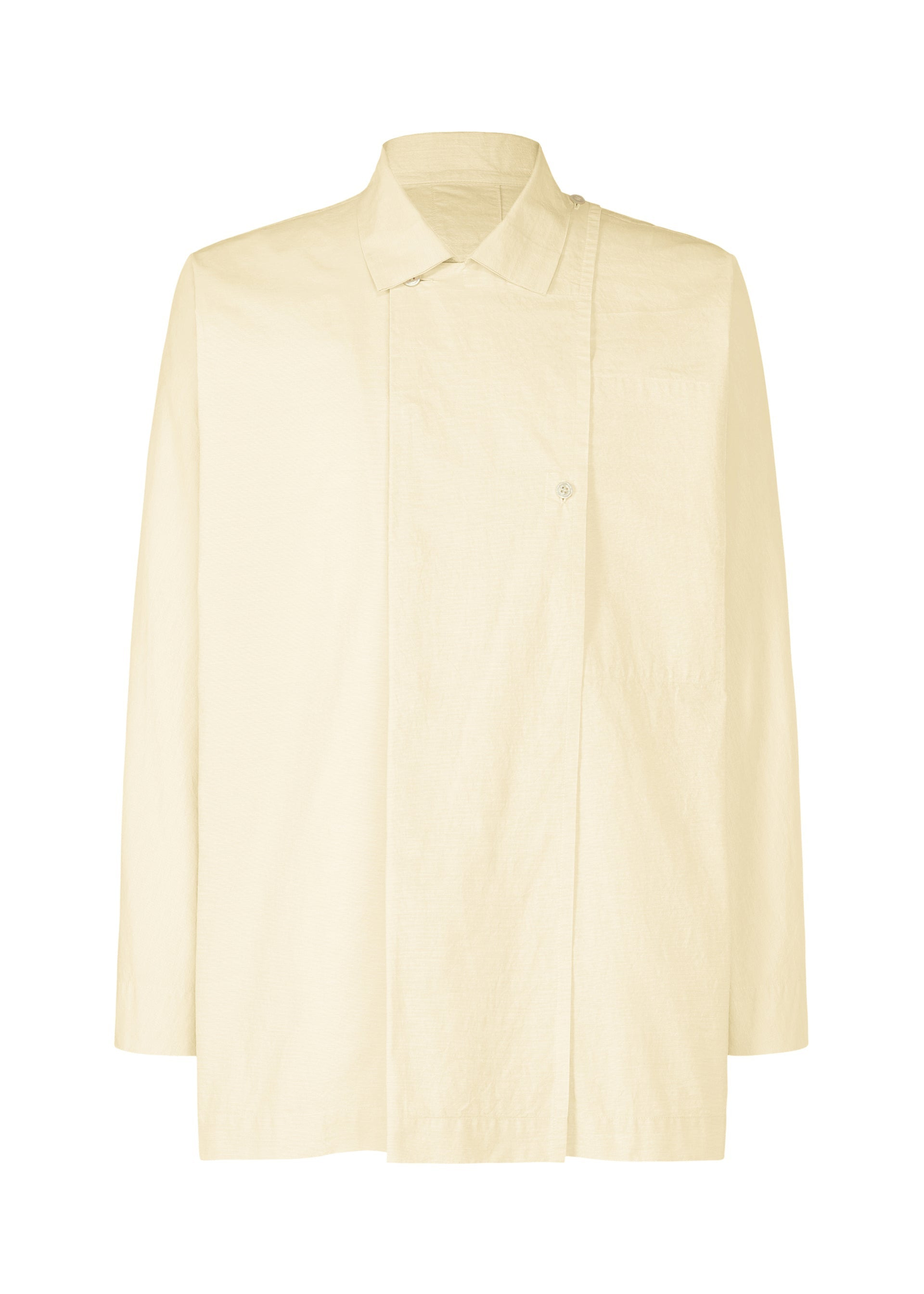 This shirt with a regular collar is characterized by its natural wrinkled look created through gradual washer processing applied to the fabric. It has a left chest pocket and slits on both sides. Product Information Material: 68% cotton, 32% nylon Country of origin: Japan neckline/collar:regular color Front opening:Hiyoku button Pocket (position):left chest Slit (position):both sides